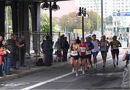 Minutenlang laufen sie an einem vorbei, bis man endlich seinen Favoriten aus der Menge der Teilnehmer und er seine Fans mit dem Schild "Go, David, Go" aus der Zuschauerschar herausgefunden. Schnell den Läufer im roten Trikot (haben fast alle, nee, aber ziemlich viele) und der Nummer 7008 fotografieren, dann ist er schon vorbei und man sieht nur noch den Rücken. Jetzt heißt es auch für die Fans an der Strecke: Schild unter den Arm klemmen und "Stehst du noch oder läufst du schon?". Also loslaufen und sich zum nächsten Punkt an der Strecke begeben. Marathon Hopping ist angesagt, das heißt jetzt für uns von der Siegessäule zum S-Bahnhof Bellevue laufen und mit der S-Bahn zur Jannowitzbrücke. "Wo laufen sie denn?" muss man unterwegs nicht fragen, man sieht sie aus dem Zugfenster auf der Strecke durch Berlin Mitte. |